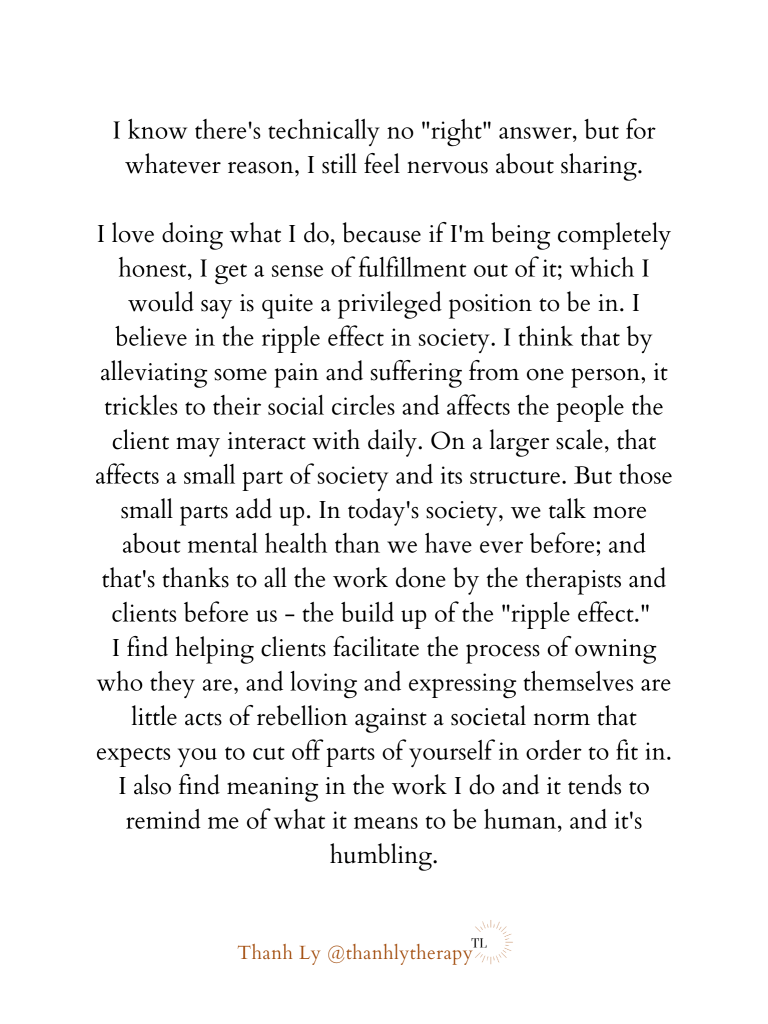 To add to these initial thoughts, it brings me joy to see someone improve or feel better by the end of our session or our time together. Clients tend to leave feeling more self-confident and self-compassionate, rather than feeling like they’re spinning loops or going through recurring cycles that keep them feeling stuck. It’s been amazing to witness their growth and journey!
